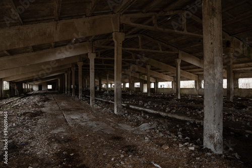 Interior of the old ruined abandoned barn for cows. Destroyed agriculture