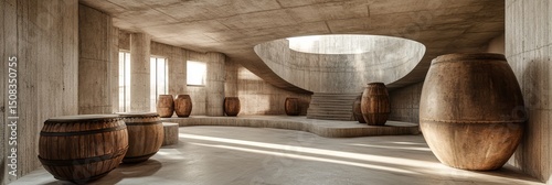 Interior space with large wooden barrels and sunlight streaming through windows.
