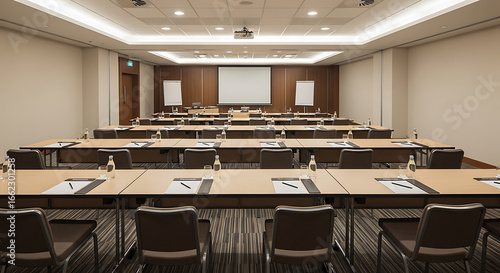 Interior view of a conference room with tables chairs and a projector screen ready for a meeting ai generated