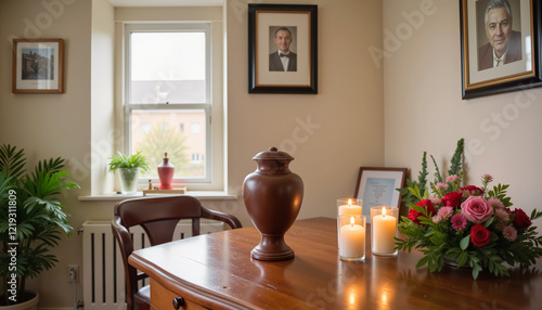 Interior view of a memorial space featuring an urn, lit candles, and floral arrangements