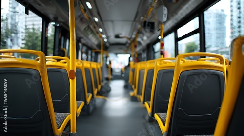 Interior View of an Empty City Bus with Rows of Yellow Seats