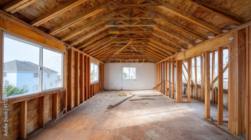 Interior view of an unfinished wooden structure showcasing exposed beams and large windows, emphasizing potential for renovation and design creativity