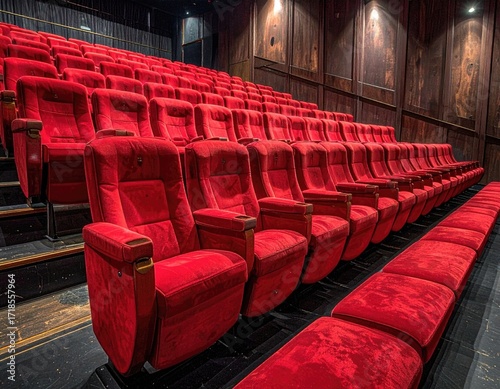 Interior View of Empty Red Theater Seating with Black Walls and Subtle Lighting
