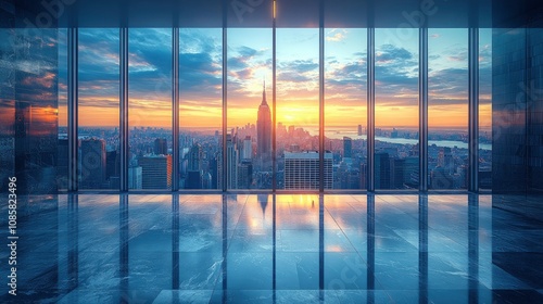 Interior view through curtain wall showing cityscape beyond, sense of space and connection