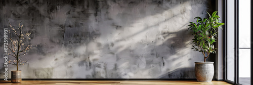 Interiors composition in dark colors and Japanese style with a window in a room with minimal furniture. Relaxing Real Estate interior design composition.