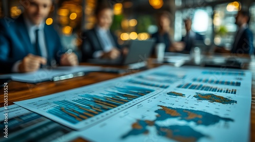 International business conference scene with corporate leaders discussing global market entry with copy space