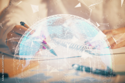 International business hologram over hands taking notes background. Concept of success. Multi exposure
