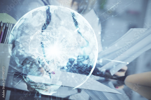 International business hologram over hands taking notes background. Concept of success. Multi exposure