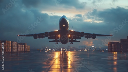 International Cargo Plane Taking Off at Dusk with Dramatic Sky