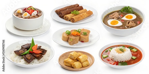 International Cuisine Concept. Assorted Asian Dishes Featuring Noodles, Rice, Meat, and Vegetables on a White Background