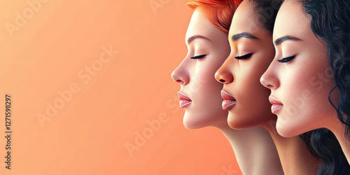 International Day for Elimination of Racial Discrimination.Women of different skin tones stand in profile with closed eyes, symbolizing unity, love,tolerance, solidarity. Banner. Copy space