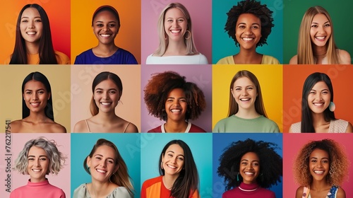 International women's day. Collage of diverse women smile over color backgrounds