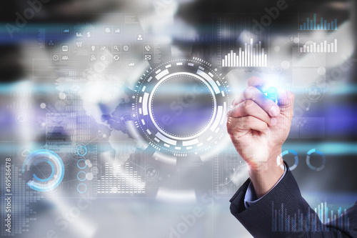 Internet, Business and technology concept. Icons, diagrams and graphs background on virtual screen.