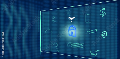 Internet interface security on blue virtual screen with customer secure connection Icons. Copy space text.