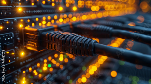 Internet LAN cable In a modern server room For storing and transmitting information through a secure internet technology network.