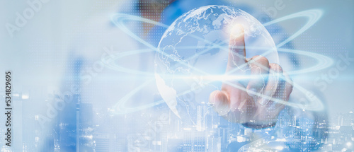 Internet of Things - IOT concept. Businessman offer IOT products and solutions. . The modern creative communication and internet network connect in smart city . Concept of 5G.