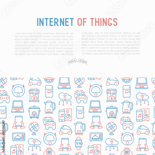 Internet of things concept with thin line icons: laptop, smart watch, cloud computing technology, kettle, speaker, smart car, robot vacuum. Vector illustration for banner, web page, print media.
