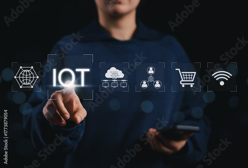 Internet of Things (IoT) concept. Person touching IoT icon with elements of cloud computing, connectivity, e-commerce, and wireless networks, symbolizing smart technology integration and data exchange