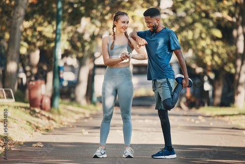 Interracial, couple and stretching for training, wellness and exercise to relax and workout in park. Health, man and woman outdoor for practice, fitness and together for bonding, healthy and talking.