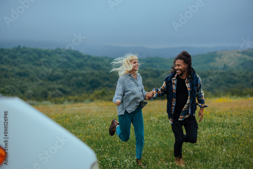 Interracial couple running across a meadow