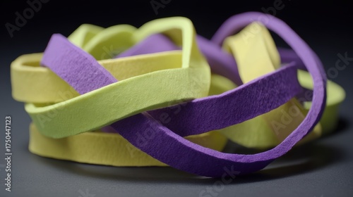 Intertwined pastel ribbons in yellow and purple hues against a dark backdrop evoking a sense of whimsical delight