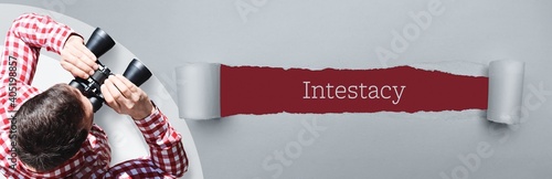 Intestacy. Man (lawyer) observing with binoculars. Focus on text/word on a ripped paper.