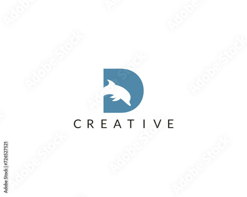 intial D latter and blue shark or dolphin or whale fin swimming on sea ocean surace. simple illustration of a big young mammal swimming out of the water surface - danger concept symbol art.