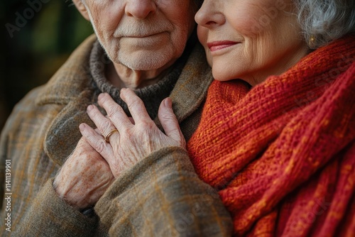 Intimate Portrait of Elderly Couple Embracing in Autumn Garden Natural Light