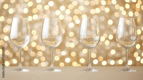 Intimate wedding and dinner concept. Elegant wine glasses against a shimmering golden backdrop.