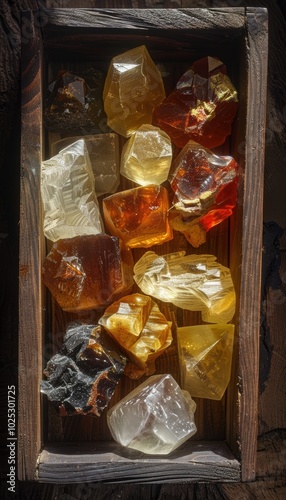 Intricate Arrangement of Copal Resins in Rustic Wooden Box for Natural Aesthetic Decoration