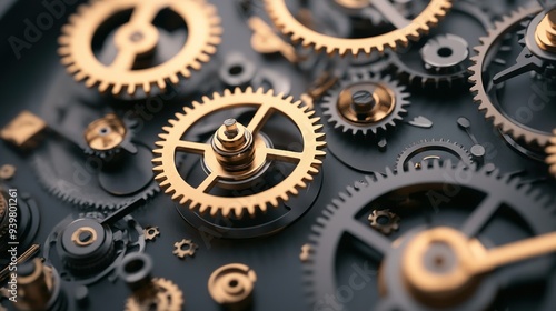 Intricate arrangement of golden gears and mechanical components against a dark background highlighting craftsmanship and engineering