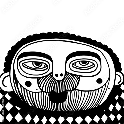 Intricate black and white illustration of a whimsical character with expressive features and a unique pattern style