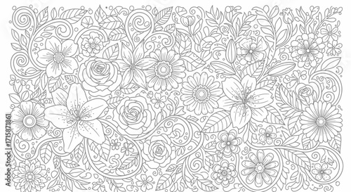 Intricate black and white line drawing of a floral pattern, depicting various flowers and foliage.