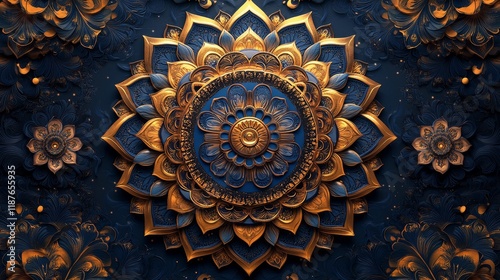Intricate blue and gold mandala with ornate floral patterns