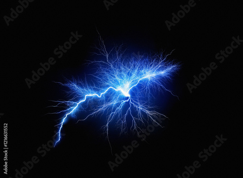 Intricate blue electrical discharge, resembling a lightning bolt, on a grainy paper texture. The dark background enhances the vibrant glow.