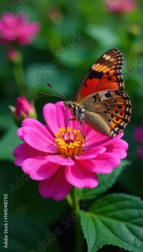 Intricate butterfly on heart-shaped petals, vibrant plant backdrop , flower, colorful