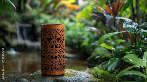 Intricate Carved Wooden Cylinder in Lush Garden Setting