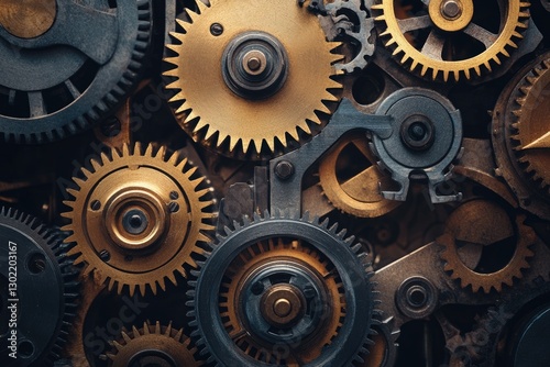 Intricate clockwork gears interlock, showcasing precision engineering and complex mechanics.