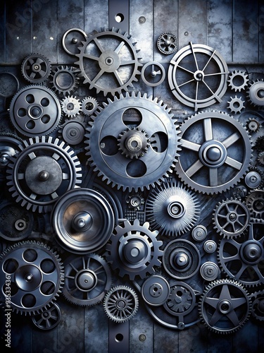 Intricate Clockwork on Rustic Wood: A captivating close-up of interlocking metallic gears, sprockets, and cogs against a weathered wooden backdrop.