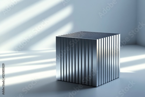 Intricate close up of a striped aluminum cube against a gray background with geometric focus