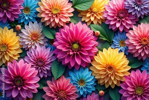 Intricate dahlia blooms in vibrant hues, forming a repeating floral pattern , seamless, white