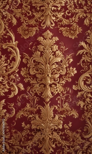 Intricate damask pattern, rich burgundy & gold hues , scroll, elegant