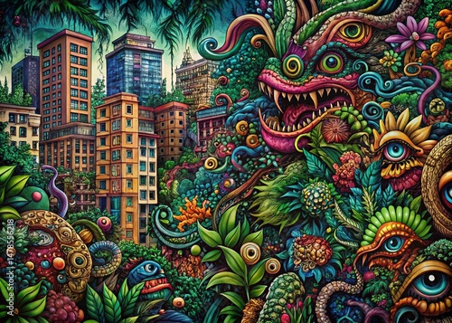 Intricate Doodle Monster Pattern on Lush Foliage - Urban Exploration Photography