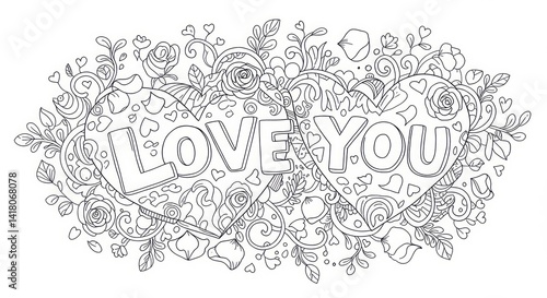 Intricate floral coloring page featuring hearts and the words Love You for Valentine's Day