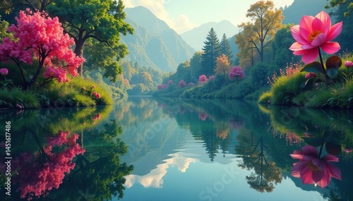 Intricate floral pattern reflected on calm lake surface, blossom, flowers