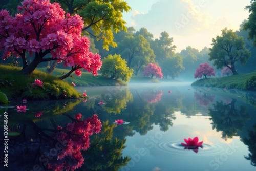 Intricate floral pattern reflected on calm lake surface, bright, design
