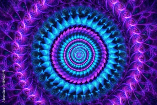 Intricate fractal artwork of vibrant purple and blue hues converging in a mesmerizing spiral