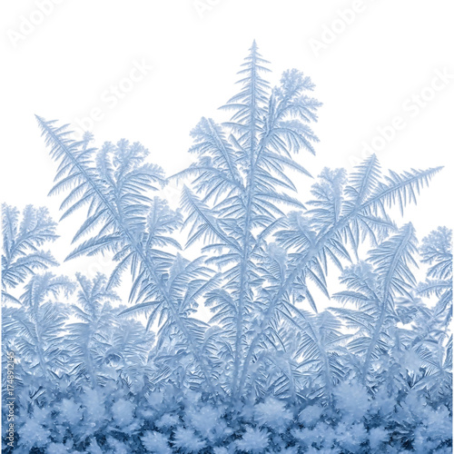 Intricate frost crystals form a delicate, icy, and beautiful winter display on a white background.