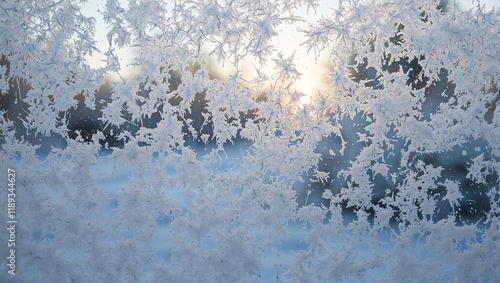 Intricate frost crystals on windowpane softly lit evoking magical winter ambiance
