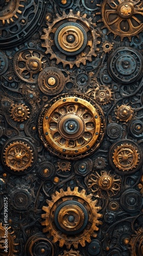 Intricate gearbox clockwork mechanism with vintage metallic cogs wheels and machinery parts in an abstract industrial background Detailed steampunk style mechanical engineering design
